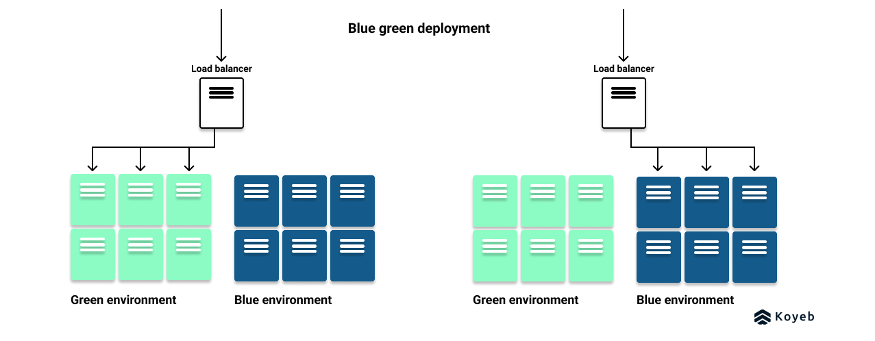 - Blue-Green 배포는 두 개의 동일한 프로덕션 환경을 유지하고, 트래픽을 한 환경에서 다른 환경으로 완전히 전환하는 전략입니다.