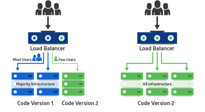 - 예를들어, Blue환경에서 기존 사용자들의 트래픽을 관리하다가, Green환경에서 새로 배포될 다음 버전의 서비스를 프로비저닝 하여 트래픽을 받을 준비가 완료되면 Blue환경의 트래픽을 Green환경으로 옮기는 전략입니다.
