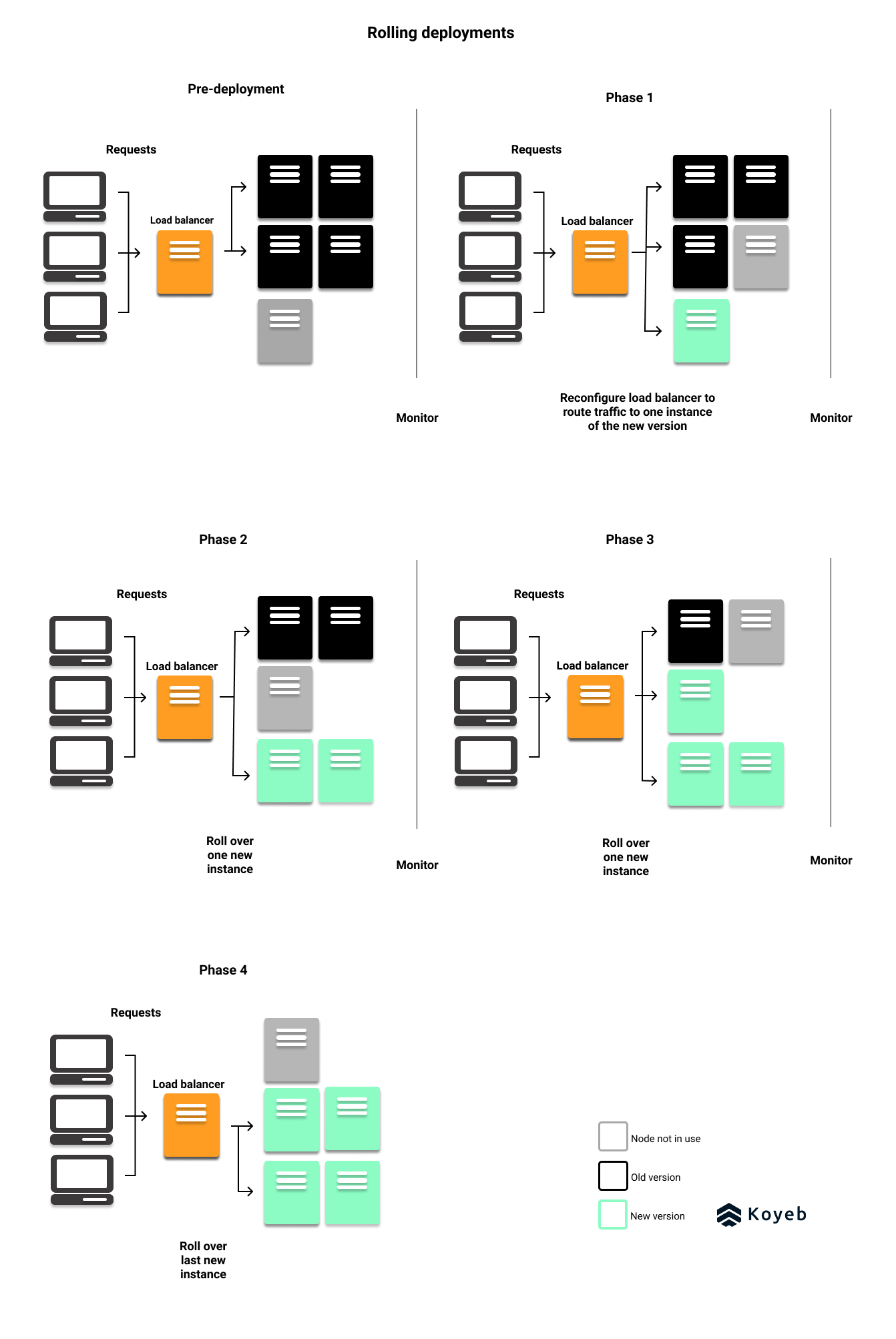 - Rolling 배포는 새로운 버전을 점진적으로 도입하면서, 기존 인스턴스를 점진적으로 교체하는 전략입니다.