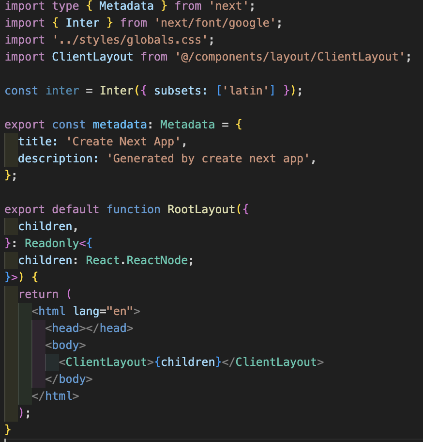 이후, 이 ClientLayout을 app 디렉토리 내부의 layout.tsx에 아래와 같이 주입해줍니다.